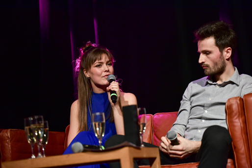 Vinderen for bedste lyddesign Josefine Skov og Tobias Scavenius, der tog prisen for bedste fotografering, mødtes i sofaen over et glas champagne.