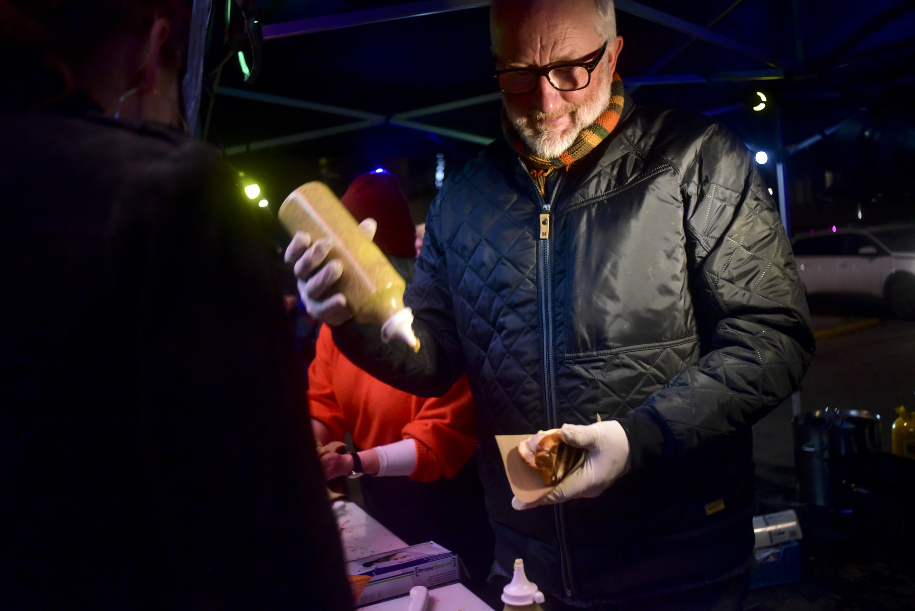 Til natmad blev der serveret hotdogs lavet af en overraskende pølsemand: Zentropa-stifteren Peter Aalbæk Jensen. Han langede 400 pølser med brød ud af sin interimistiske vogn, mens han fik en snak med prisfestens gæster.