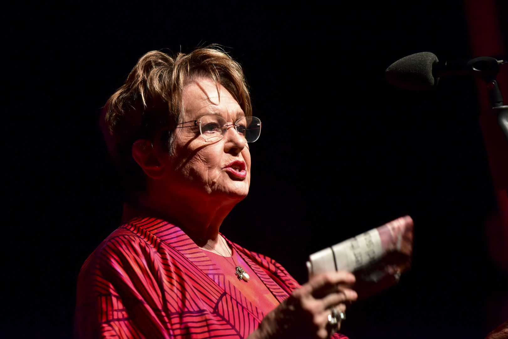 Ghita Nørby var ulasteligt klædt i en pompøs, rød kjole, da hun med Jesper Zuschlag i hånden gik på scenen for at uddele prisen for bedste scenografi.