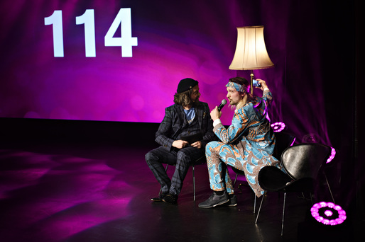 Den velklædte komponist Lasse Aagaard vinder for sin originale musik i Esther Wellejus’ dokumentar Vi lader billedet stå et øjeblik. Han tager her en snak med jurymedlem og animationsinstruktør Tor Fruergaard.