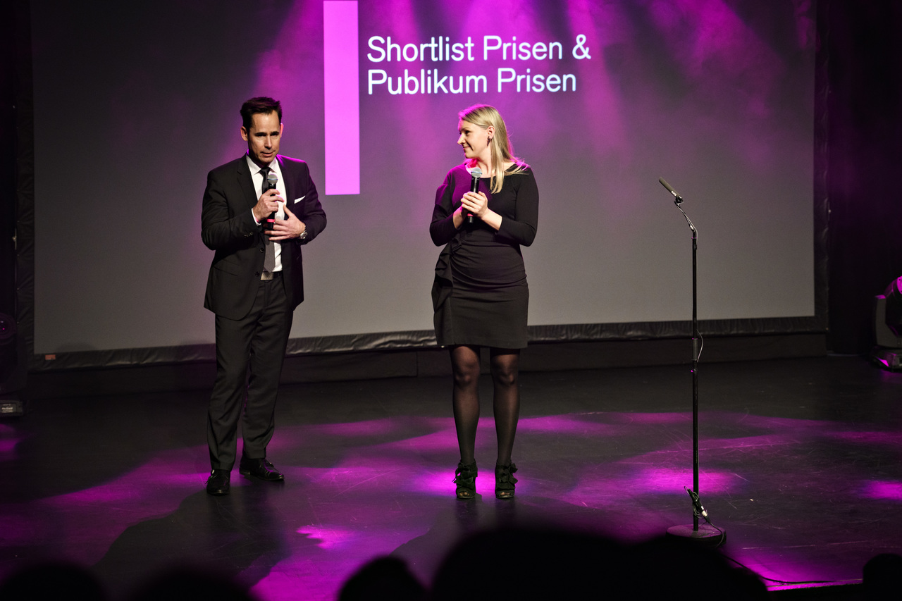 Prisfesten er sponsoreret af C More og støttet af Det Danske Filminstitut, så Jens Arnesen fra streamingtjenesten og Louise Haugstrup Jensen fra Filminstituttet går på scenen for at overrække Publikum Prisen.