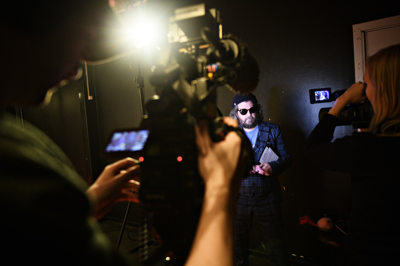 Den velklædte komponist Lasse Aagaard vinder for sin originale musik i Esther Wellejus’ dokumentar Vi lader billedet stå et øjeblik. Han tager her en snak med jurymedlem og animationsinstruktør Tor Fruergaard.