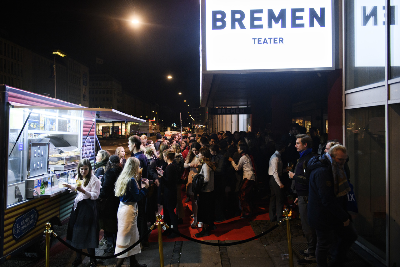 Foran Bremen Teater holder en madvogn fra Chela Empanadas, som efter prisshowet forsyner de mange festglade mennesker med lækker spise fra det argentinske køkken.