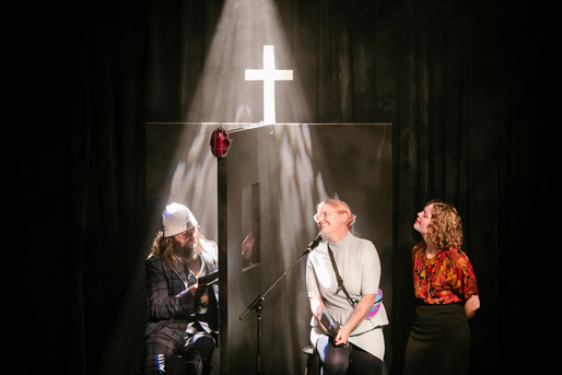 Til stor applaus træder værten Anders Lund Madsen ind på scenen iført præsteklæder. Han lover alle i salen syndsforladelse, før aftenen er omme.