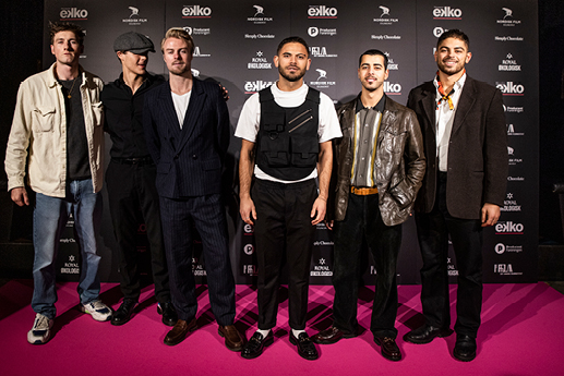 Holdet bag Filmskole-afgangsfilmen Frie mænd er mødt talstærkt op på den røde løber med instruktør Óskar Kristinn Vignisson i centrum med sort blazer. Fra venstre er han omgivet af Diana Queirós – som vandt for filmens lyddesign – Christian Karlsen, Juan Eduardo Becerra Bastias, Mie Sofie Nielsen, Søs Thøstesen, Anton Hjejle, Signe Borrevang, Martha Lieberath Mørk og Signe Krab Nymann.