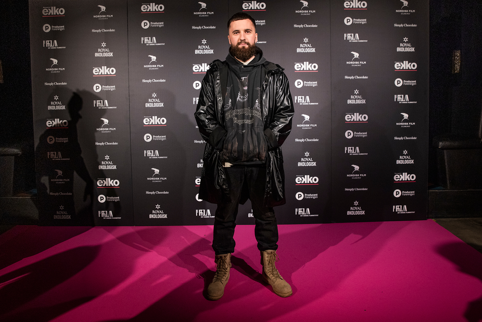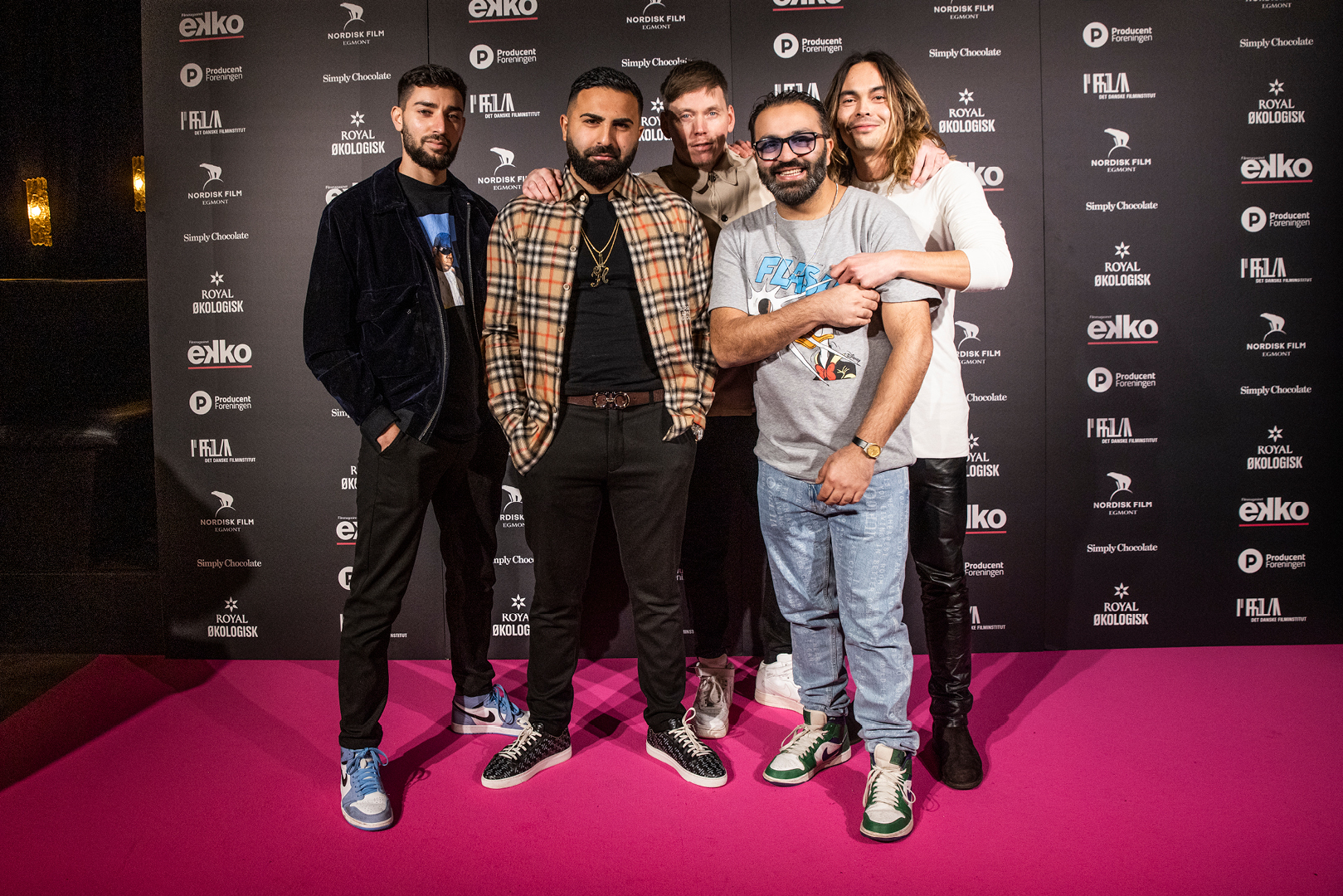 Bokseringen er skiftet ud med den røde løber for den tidligere verdensmester i kampsporten MMA, Rhassan Muhareb (th.), der var nomineret for sit skuespil i Partisan. Han får selskab af manuskriptforfatteren Frederik Rye Nielsen (tv.) og instruktørtalentet Jahfar Muataz, der også var nomineret for den hårdtslående film.