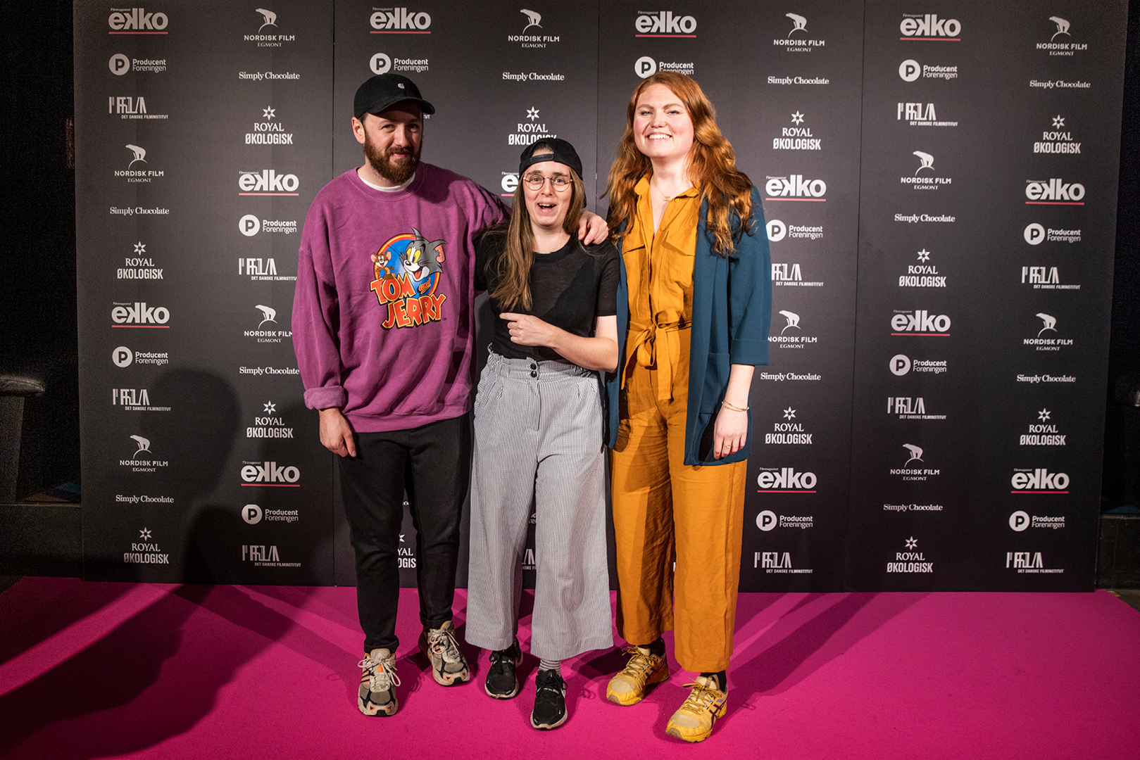 Instruktør Kasper Møller Rask virker afslappet i Tom & Jerry-sweater, selv om hans kortfilm November er nomineret til bedste fiktion, fotografering og klipning. Med sig har han Christina Bach (midt) og filmens producer Iben Søtang.