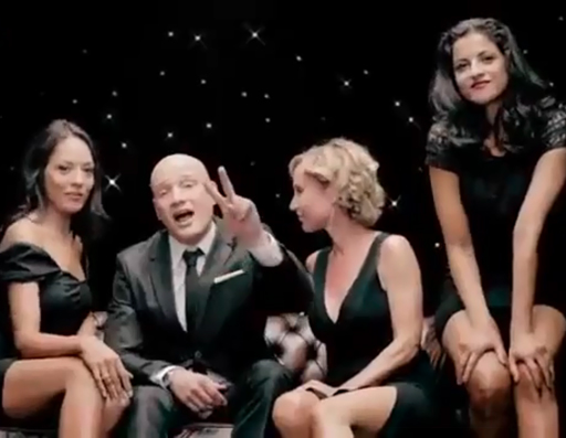 I en sofa sidder MC Clemens omgivet af fire TV 2-værter – Natasja Crone, Cecilie Beck, Divya Das og Karin Cruz – der iført lårkort kjole kælent læner sig op ad rapperen og gør sig lækre.