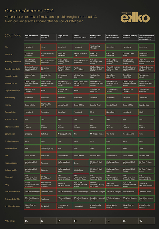 De to herrer har begge fået sytten rigtige i deres spådom om vinderne i de 23 kategorier ved Oscar-uddelingen. Magnusson gik lidt frem og tilbage i sine gæt, men endte med at holde på The Father i kategorien for manuskript baseret på andet forlæg.