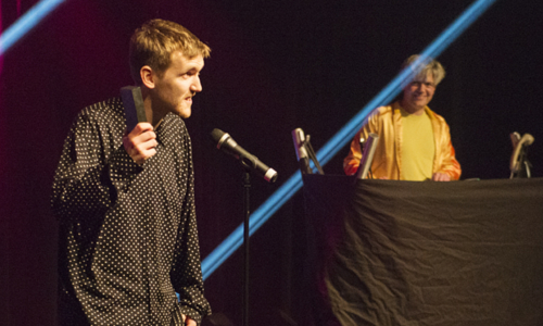 Han har taget holdet fra filmen med på scenen, og deler en en historie om en samtale om aktiv dødshjælp, han har haft med sin mor. Og så takker han også Super16!