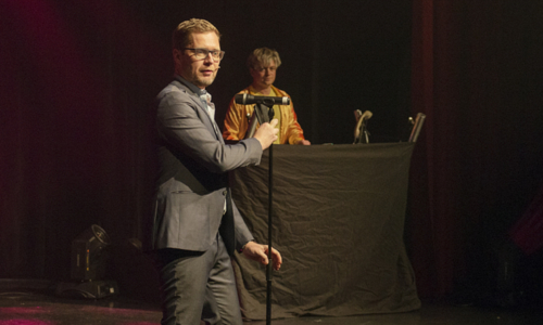 Han har taget holdet fra filmen med på scenen, og deler en en historie om en samtale om aktiv dødshjælp, han har haft med sin mor. Og så takker han også Super16!