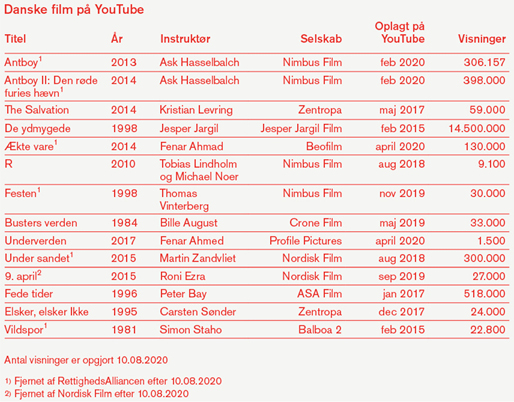 – Vi har været i kontakt med blandt andre Nordisk Film og Zentropa, som bekræfter, at Under sandet, 9. april og The Salvation ligger ulovligt på YouTube!