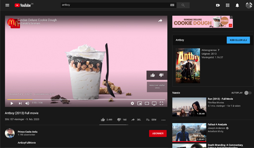 Man betaler ikke for at se Antboy ulovligt på YouTube, men techgiganten og uploaderen tjener penge ved at have reklamer for blandt andet McDonald’s undervejs i filmen.