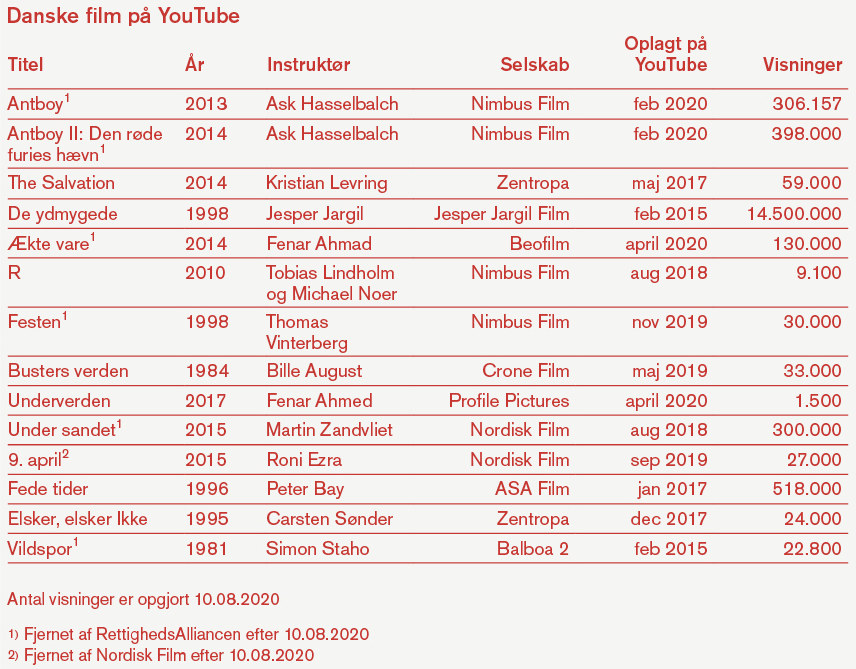 – Vi har været i kontakt med blandt andre Nordisk Film og Zentropa, som bekræfter, at Under sandet, 9. april og The Salvation ligger ulovligt på YouTube!