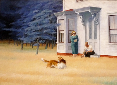 Eksemplaret har en vis lighed med den, som holder vagt på Edward Hoppers maleri Cape Cod Evening fra 1939 (se maleriet nederst i artiklen). Filmen er en associations-leg over den amerikanske kunstners klassiske billede af en kvinde, en mand og en hund foran deres hvidmalede og velbjergede American home i aftensolen.