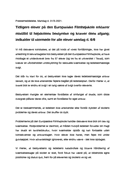 ”Vi må desværre konstatere, at det på trods af vores forhåbninger ikke har givet anledning til selvransagelse hos bestyrelsen på Den Europæiske Filmhøjskole at have modtaget et underskrevet brev fra 57 elever (og tre fra et universitet i Texas), som kræver en uforbeholden undskyldning for seksuelle krænkelser og ledelsesmæssige svigt,” skriver repræsentanter for de tidligere elever.
