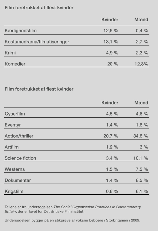 En stor undersøgelse foretaget for det britiske filminstitut i 2003 viser, at der er 31 gange så mange kvinder som mænd, der foretrækker at se ”romance” (og ti gange så mange mænd som kvinder, der foretrækker at se krigsfilm).