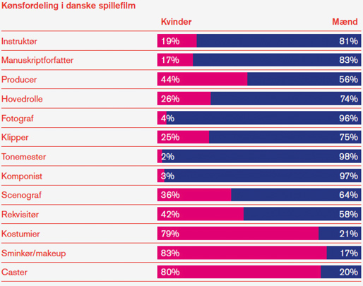 Til gengæld dominerer kvinderne overlegent som kostumierer, sminkører og castere, hvor omtrent 80 procent er kvinder.
