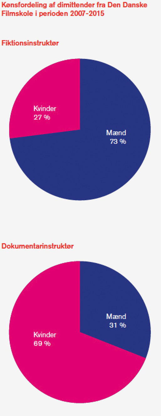 Af de 125 spillefilm, som har fået produktionsstøtte af Filminstituttet fra 2010 til 2015, var kun nitten procent instrueret af en kvinde, mens sytten procent var skrevet af en kvindelig manuskriptforfatter.