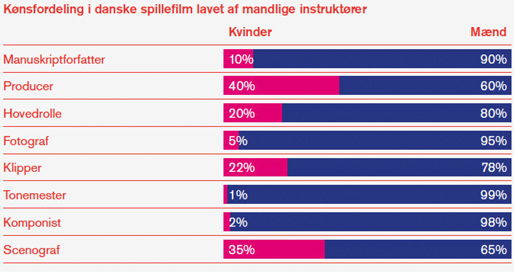 Af de 125 spillefilm, som har fået produktionsstøtte af Filminstituttet fra 2010 til 2015, var kun nitten procent instrueret af en kvinde, mens sytten procent var skrevet af en kvindelig manuskriptforfatter.