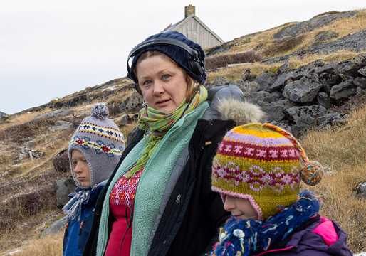 Isabella Eklöf på optagelse i Grønland sammen med to af børnene i filmen.
