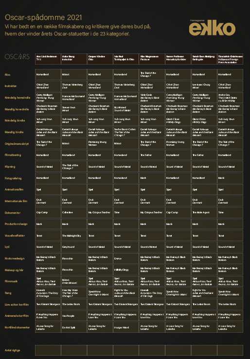 En række danske filmfolk og kritikere kommer i Ekkos Oscar-panel med deres bud på, hvem der sejrer i samtlige kategorier ved årets prisfest. Se skema med deres gæt!