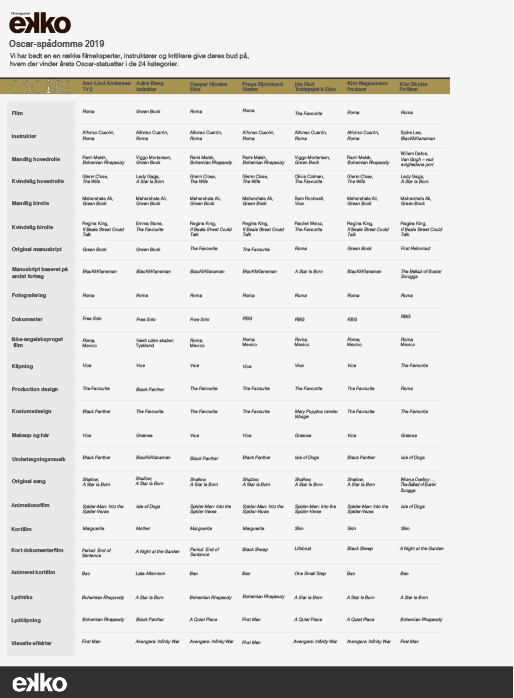 Endelig er der fra egen række også deltagelse af Ekkos Oscar-ekspert Casper Hindse – der med sejre i de to seneste år har vist sig at være skarp – og Ida Rud, der blogger for Ekko og arbejder for Troldspejlet.