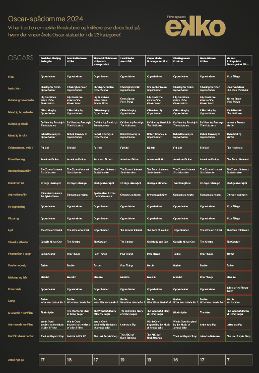Modsat Hindse forudså han til gengæld, at Poor Things ville vinde både den kvindelige hovedrolle til Emma Stone og kostumedesignet. I sidstnævnte kategori gættede alle andre på Barbie, som blev aftenens taber med blot én pris til Billie Eilish’ What Was I Made for?-sang.