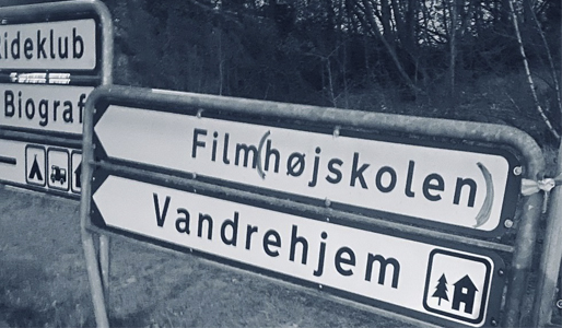 Skiltet med vejangivelse til Filmhøjskolen i Ebeltoft er blevet skrevet på af en person, der øjensynligt mener, at højskoletanken ikke lever i bedste velgående på stedet (foto: uoplyst).