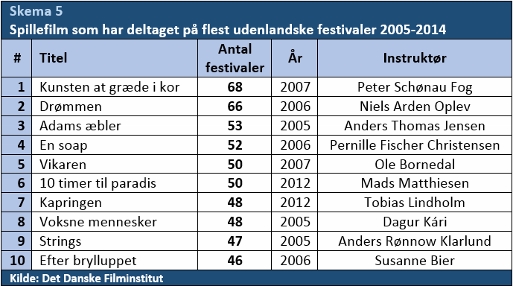 Danske spillefilm (fiktion), der havde biografpremiere i 2005, blev vist i konkurrence ved 543 filmfestivaler. Spillefilm, der havde biografpremiere i 2014, er kun blevet vist på 133 festivaler.