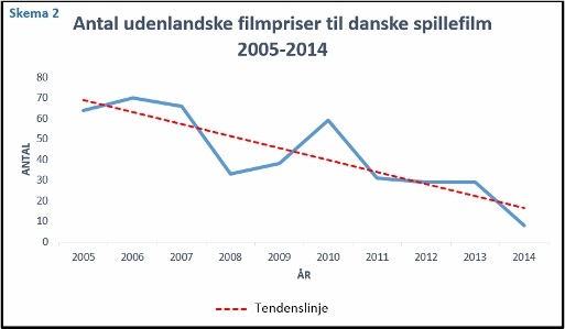 Danske spillefilm fra 2005 vandt 64 priser ved filmfestivaler, mens tallet for spillefilm fra 2014 er helt nede på otte priser.