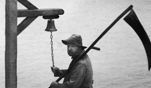 Her optræder en gammel mand med en le, der ringer en klokke, men det gamle billede viser ham kun fra ryggen. I det nye, taget af Casper Sejersen, kan vi derimod genkende von Triers ansigt stikke hovedet frem og antyde inspirationen.