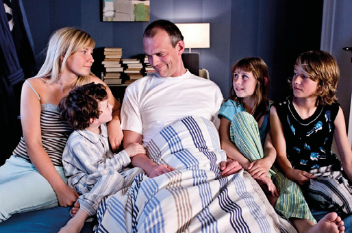 Seksten år gammel spillede Carla Mickelborg (tv.) Søs i Far til fire gi’r aldrig op, hvor Niels Olsen har rollen som Far, der skal tage sig af en stor børneflok (foto: Christoffer Regild).