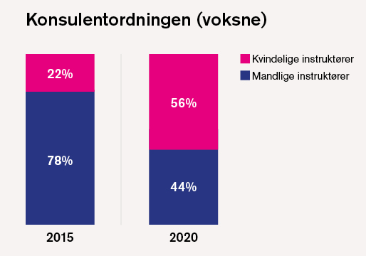 Og hvis man ser på konsulentordningen for voksne, som Næss varetager sammen med Kalle Bjerkø, er der faktisk nu en overvægt af kvindelige instruktører.