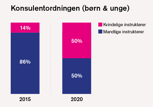 På konsulentordningen for børn og unge, hvor den mandlige dominans i 2015 var endnu større, bød sidste år på fuldstændigt lighed mellem kønnene.