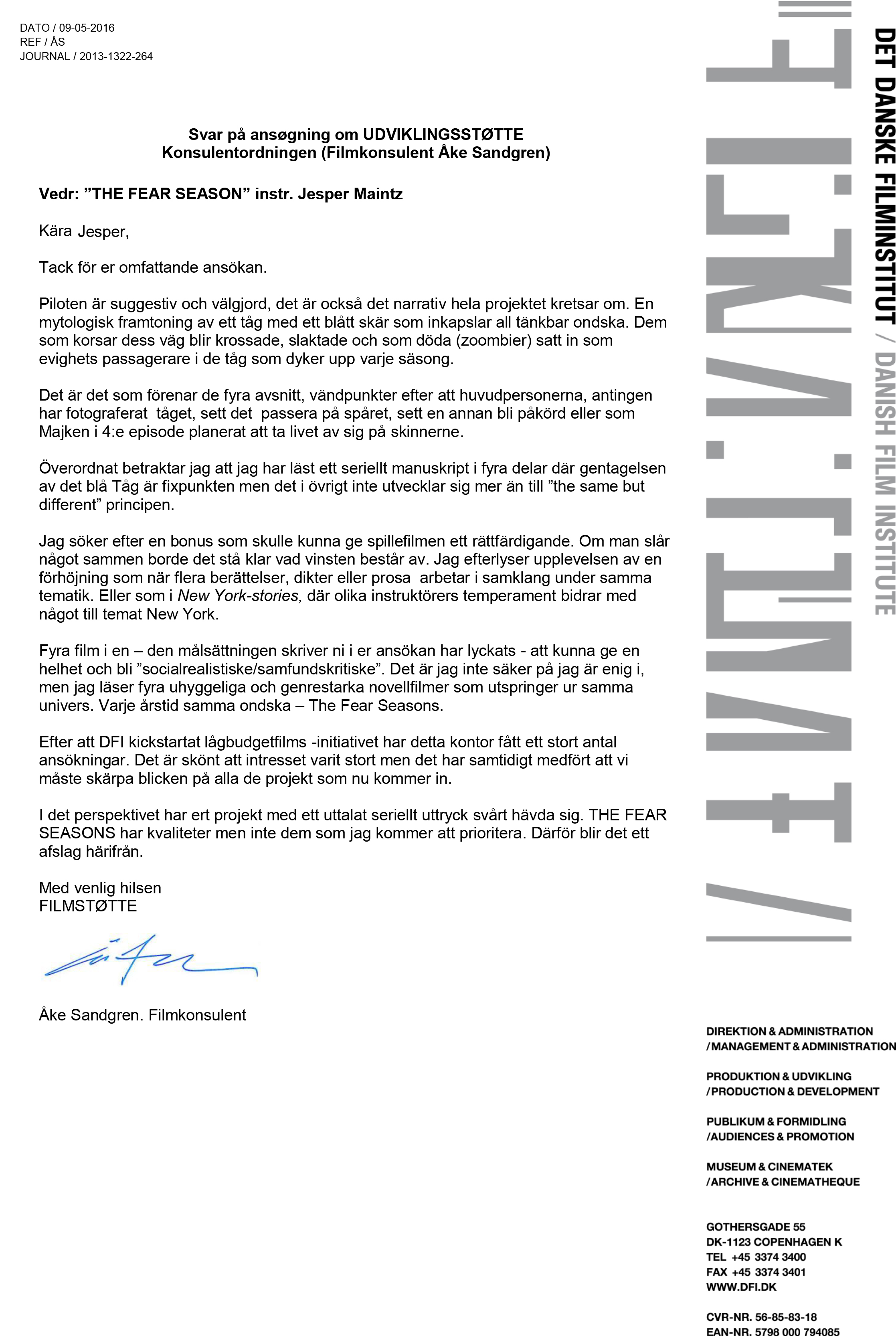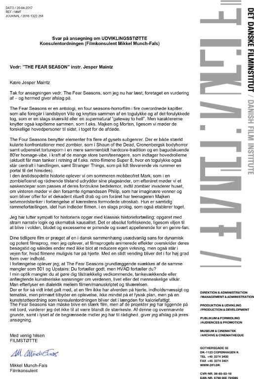 Så fem år efter, at jeg skrev den første ansøgning til Rasmus Horskjær, fik vi endelig udformet vores sidste forsøg ved Det Danske Filminstitut.
