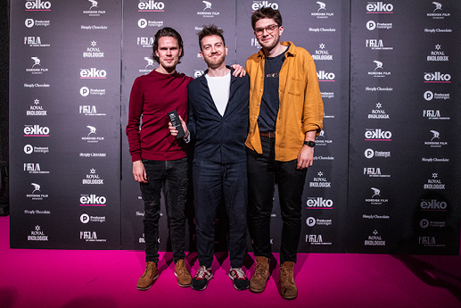 Philip Hedegaard Povlsen (midt) var mildest talt overrasket over at modtage aftenens hovedpris, Shortlist Prisen, og de medfølgende 25.000 kroner for den kulsorte samfundssatire Osworld. Med sig havde instruktøren skuespillerne Jesper Møller (tv.) og John Bonadies.