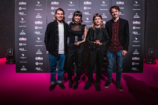 Holdet bag R[evol]ution Of Love var med god grund oppe og køre ved filmfesten, hvor Sophie Amalie Haumann (midt) snuppede prisen for bedste scenografi, mens Søren Haahrs pulserende musik blev kåret som årets bedste. På den røde løber fik de selskab af fra venstre filmens fotograf Sophie Caroline Gohr, instruktør Louise Hylland og producer Julie Louise Nielsen.
