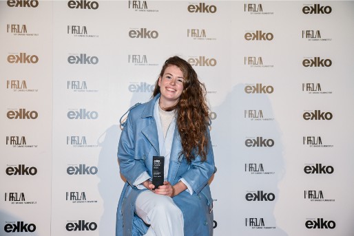 Kristine Bidstrup holder glad sin statuette frem sammen med hele filmholdet bag Lidt endnu, der udspringer af et ophold på Filmskolen Møn. Filmen vinder Publikum Prisen som den mest populære af de 150 film, der er kommet på Ekko Shortlist i det forløbne år.