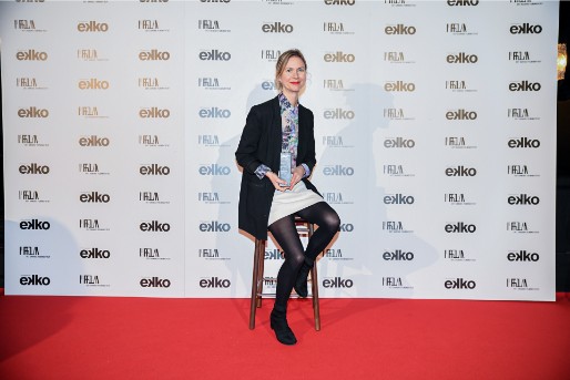 Kristine Bidstrup holder glad sin statuette frem sammen med hele filmholdet bag Lidt endnu, der udspringer af et ophold på Filmskolen Møn. Filmen vinder Publikum Prisen som den mest populære af de 150 film, der er kommet på Ekko Shortlist i det forløbne år.