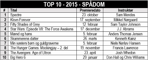 Jeg vover det ene øje og forudser, at 2015 billetsalgsmæssigt bliver det bedste år siden 1981, hvor 16,2 millioner mennesker satte sig i biografernes sæder. Her er mit bud på de ti film, der næste år vil trække flest tilskuere i biograferne: