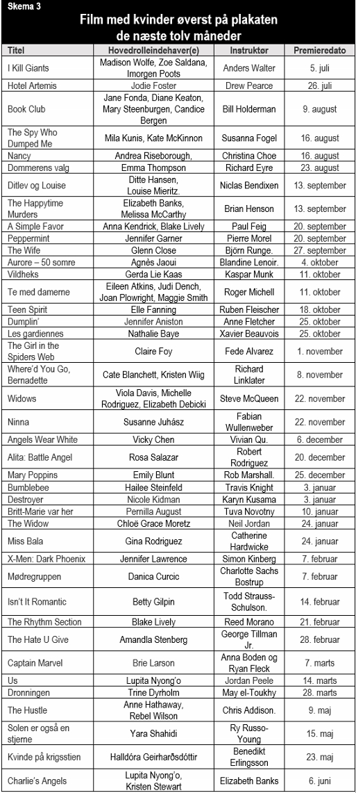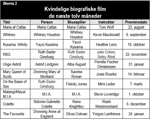 Et helt andet kapitel er kvindelige skuespillere, og her står kvindelige karakterer i allerførste række i de næste tolv måneder. Det gælder ikke mindst biografiske film om kvinder (skema 2).