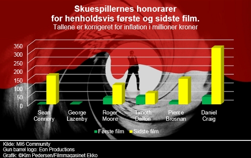 Sean Connery fik for eksempel kun knap en million kroner for at medvirke i Dr. No, men hele 167 millioner kroner for at medvirke i Diamonds are Forever (1971), når man korrigerer for inflation. Højeste honorar nogensinde, selv hvis man korrigerer for inflation, er gået til Daniel Craig. Han fik 328 millioner kroner for at medvirke i Spectre.