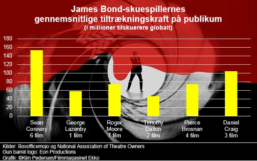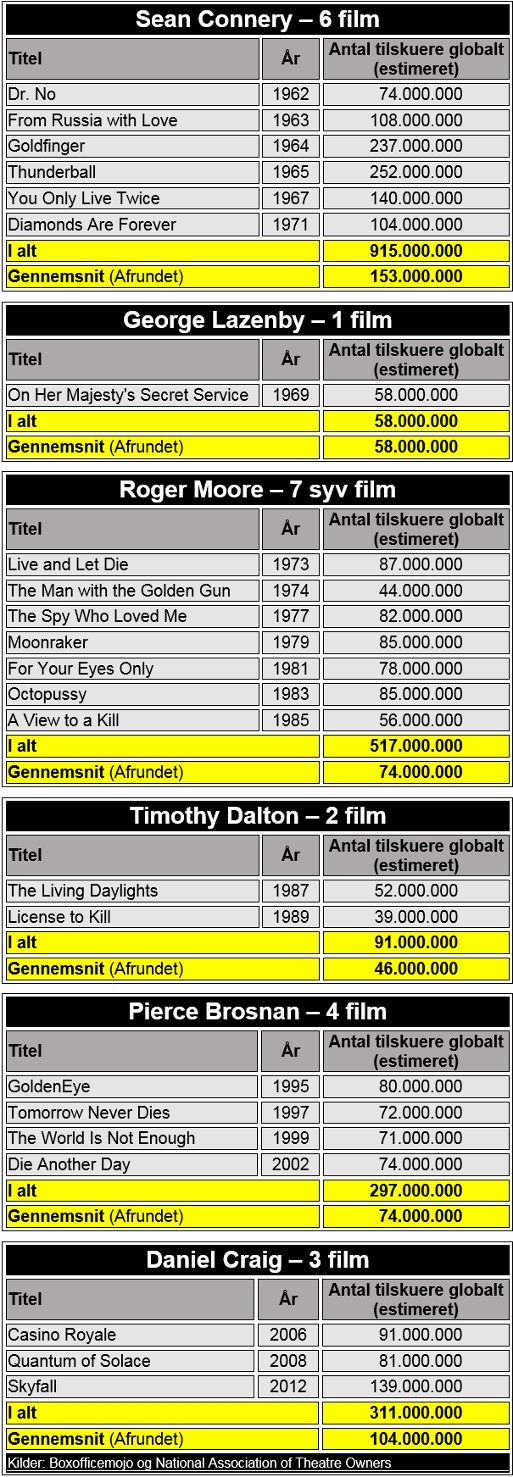 Samtidig giver ovenstående skema en god forklaring på, hvorfor Timothy Dalton og George Lazenby kun kom til at agere James Bond i henholdsvis to og en enkelt film. Færre gad se dem.