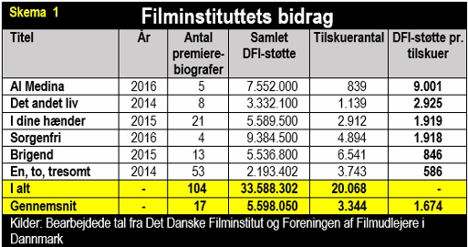 Som det fremgår af skema 1, er de små danske film en dyr affære for de danske skatteydere. Gennemsnitligt fik hver tilskuer til de seks små danske film hele 1.674 skattekroner med i baglommen, da de tog plads i biografen. Mest ekstreme tilfælde var Al Medina, hvor baglommen blev fyldt med hele 9.001 kroner.