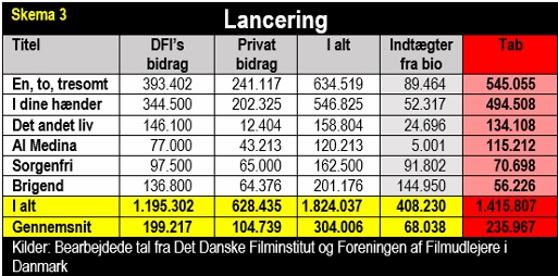 Som det kan ses i nedenstående skema 3, giver det ikke blot antydning af mening at udsende de små danske film i biograferne. Der kastes i vid udstrækning blot gode penge efter dårlige, og graven graves blot endnu dybere.