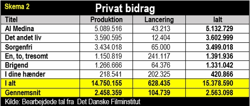I skema 2 kan filmens private bidrag iagttages. Men her kommer vi ind på private menneskers økonomi, hvorfor jeg desværre ikke kan afsløre, hvordan privatkapitalen er skruet sammen.