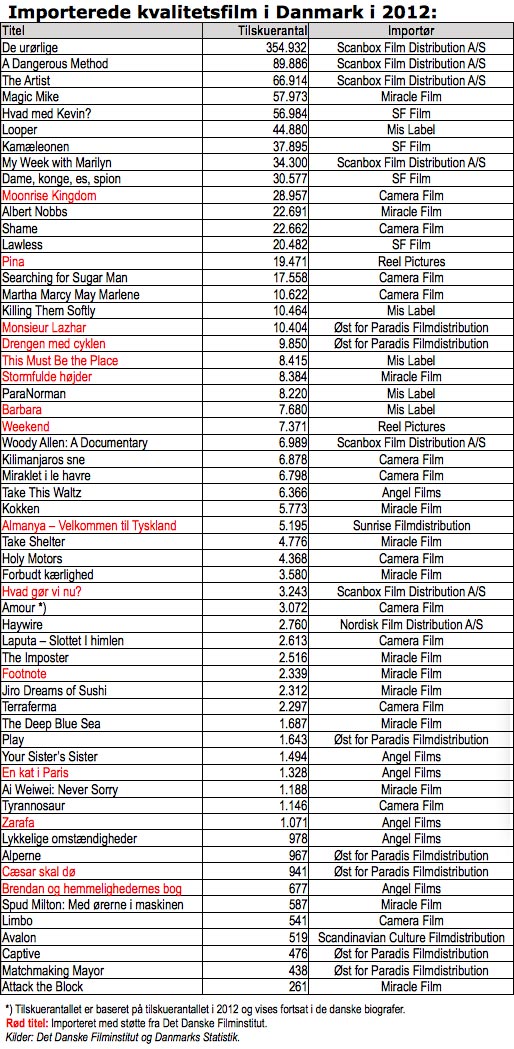 107 spillefilm blev selvstændigt importeret til de danske biografer i 2012 og 53 % af de importerede film var af høj kvalitet. I denne sammenhæng vurderes film værende af høj kvalitet, såfremt de danske filmanmeldere i gennemsnit gav filmen fire stjerner eller herover.