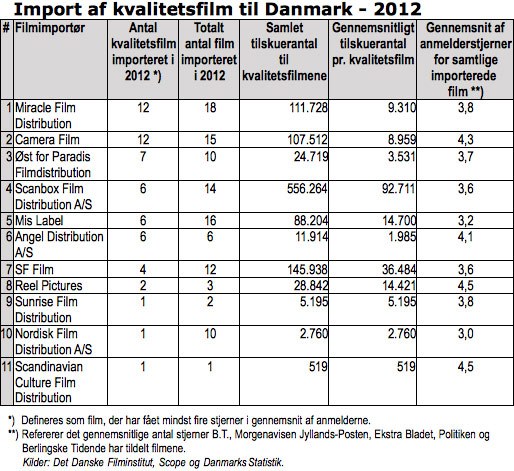 107 spillefilm blev selvstændigt importeret til de danske biografer i 2012 og 53 % af de importerede film var af høj kvalitet. I denne sammenhæng vurderes film værende af høj kvalitet, såfremt de danske filmanmeldere i gennemsnit gav filmen fire stjerner eller herover.