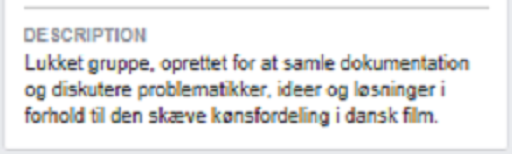 Forleden faldt jeg over en Facebook-side kaldet ”Kvinder i film”. I beskrivelsen på siden står der, at siden er en ”lukket gruppe, oprettet til at samle dokumentation og diskutere problematikker, ideer og løsninger i forhold til den skæve kønsfordeling i dansk film”.